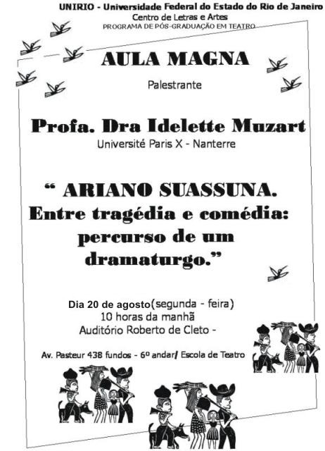 Conferência da Profa. Idelette Muzart - 20/08/2007 A Conferência organizada pelo Laboratório trouxe ao Brasil a Profa. da Université de Paris X – Naterre, com a qual a UNIRIO mantém um importante intercâmbio. Pesquisadora da Linha de Cultura popular e interessada pela dramaturgia brasileira, a Profa Idelette apresentou a Conferência “Ariano Suassuna entre tragédia e comédia: percurso de um dramaturgo”, na Aula Magna do 2º semestre da Pós Graduação em Artes Cênicas, no auditório da Escola de Teatro. |