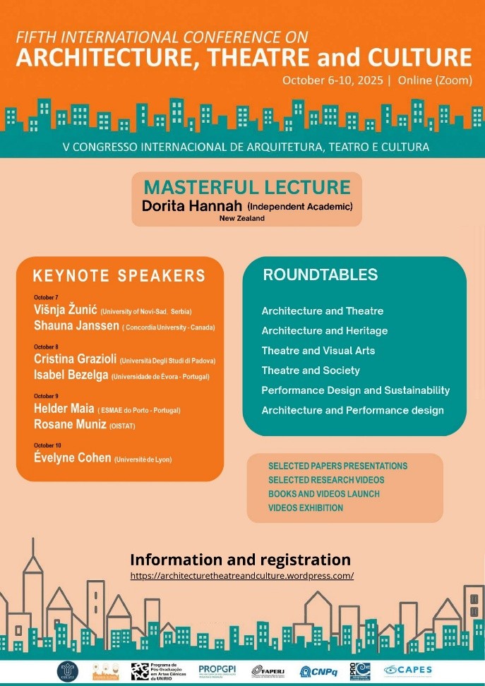 THE FIFTH INTERNATIONAL CONFERENCE ON ARCHITECTURE, THEATRE, AND CULTURE (06-10 OCTOBER) - O evento - 2025 O Laboratório de Estudos do Espaço Teatral e Memória Urbana LEG T5 em conjunto com o Programa de Pós Graduação em Artes Cênicas realizou a V Conferência Internacional sobre Arquitetura, Teatro e Cultura – Fifth International Conference on Architecture, Theatre and Culture nos dias 06,07,08,9 e 10 de outubro de 2025, na Universidade Federal do Estado do Rio de Janeiro (https://architecturetheatreandculture.wordpress.com/), de forma remota. O evento proporcionou aos pesquisadores de diferentes instituições de ensino e pesquisa amplos debates sobre os três eixos disciplinares do Congresso: a Arquitetura Teatral, o Teatro (a cenografia, a cena teatral, a cidade e as artes performativas) e a Cultura (em especial o Patrimônio Cultural). O evento constou de 8 conferências, sendo 7 de renomados pesquisadores internacionais e 1 de pesquisadora nacional que se destacam em suas áreas de atuação, 10 Mesas Redondas, com grande presença de palestrantes estrangeiros; 16 comunicações previamente selecionadas pelo Comitê Científico para as Mesas-Redondas e 21 vídeos de pesquisa de graduandos e mestrandos. As atividades ocorreram entre 9:00h e 20:00h ao longo dos cinco dias, incluindo atividades de extensão, como o lançamento de livros e a exibição do mais recente documentário realizado por uma das equipes do Laboratório. O Congresso representou uma excelente oportunidade para que os alunos e profissionais interagissem com diversos pesquisadores do país e do exterior que atuam na interseção das três áreas de conhecimento do evento, ampliando a possibilidade de estágios em laboratórios de outras universidades no Brasil e no exterior. No primeiro dia, além da Conferência Magistral, houve o lançamento de 5 livros. No segundo dia, ocorreu a exibição do documentário, realizado por uma equipe do Laboratório. No último dia do Congresso, dia 10 de outubro, realizou-se a reunião do Comitê Científico para avaliar as inovações e contribuições introduzidas pelos pesquisadores nacionais e internacionais que investigam os três temas da Conferência, sendo produzida uma Ata com uma análise circunstanciada do estado da arte nos três campos de pesquisa. PROGRAMAÇÃO FINAL DO CONGRESSO 1.2- Resultados efetivamente obtidos com o evento • O objetivo de aprimorar as atividades de pesquisa, ensino e extensão, entre acadêmicos, professores, pesquisadores, bem como membros da comunidade em geral foi plenamente alcançado com uma maior internacionalização do Programa de Pós-Graduação em Artes Cênicas. No cerne do debate esteve a questão da discussão da arquitetura teatral, das relações entre o teatro e a cidade, do patrimônio cultural representado por edificações teatrais, bem como as formas de expressão contemporâneas das possíveis adaptações de espaços alternativos para a experiência teatral. Muitos conceitos inovadores nas três áreas do Congresso foram apresentados e discutidos. (ver a ATA) • As 8 conferências internacionais e nacionais, as 10 mesas redondas propiciaram acalorados debates sobre a história da arquitetura teatral, enfatizando também os novos rumos para o lugar teatral, seja no espaço público, seja em espaços alternativos ou que se aproprie de paisagens naturais. A conferência magistral de Dorita Hannah, da Nova Zelândia, assim como as conferências de Shauna Janssen, do Canadá, e Visnja Zunic, da Servia, acrescentaram muito ao Congresso, visto que as três trabalham com conceitos decolonizadores e com a valorização das culturas locais, muito atuais para o campo da arquitetura destinada às artes performativas. A conferência da pesquisadora italiana Cristina Grazioli revisitou e valorizou conceitos de iluminação na arquitetura teatral contemporânea partindo de exemplos históricos e de questões ecológicas. Também houve efetiva contribuição no campo da cenografia, das práticas artísticas e práticas de conservação e valorização do patrimônio cultural nas conferências de Helder Maia e Evelyne Cohen. Foram apresentadas formas inovadoras de diálogo entre espaço, comunidade e teatro, tema da conferência de Isabel Bezelga da Universidade de Évora, com a qual temos um Acordo de Cooperação Acadêmica. A conferencista brasileira, Rosane Muniz, representando a OISTAT- International Organisation of Scenographers, Theatre Architects and Technicians, discutiu a relevância dos congressos e festivais para o desenvolvimento de ideias no campo das artes performáticas. As sete mesas-redondas de palestrantes discutiram relevantes pesquisas nas três áreas, apresentadas por renomados pesquisadores convidados como expositores e debatedores, além das três mesas de pesquisadores que atenderam ao Call for Papers, selecionados pelo Comitê Científico, com contribuições valiosas para os campos de investigação. Os resumos expandidos foram publicados no Book of Extended Abstracts disponibilizado para consulta no site do Laboratório ( Ver Book of Extended Abstracts) (VER - Book of Extended Abstracts) • Além do lançamento de diversos livros sobre as temáticas do Congresso, a exibição do documentário São Cristóvão, Arredores e Praça da Bandeira e outros trabalhos audiovisuais que foram exibidos para uma audiência considerável muito valorizou o Congresso, visto que participantes de inúmeros países ficaram conhecendo os exemplos brasileiros e estrangeiros da criação de espaços teatrais, de práticas artísticas inovadoras de valorização do patrimônio cultural material e imaterial. No âmbito da pós-graduação, tanto nas Artes Cênicas quanto na Arquitetura e na História, foi um sucesso traçar a trajetória das soluções adotadas em cada época para o edifício teatral. Muitos desdobramentos positivos já estão em fase de implementação, em especial na UNIRIO, na qual pós-graduandos fi