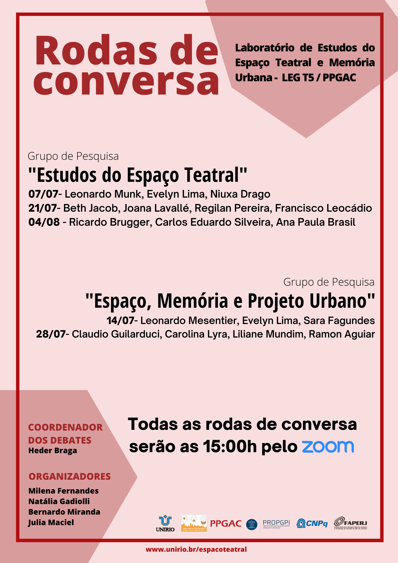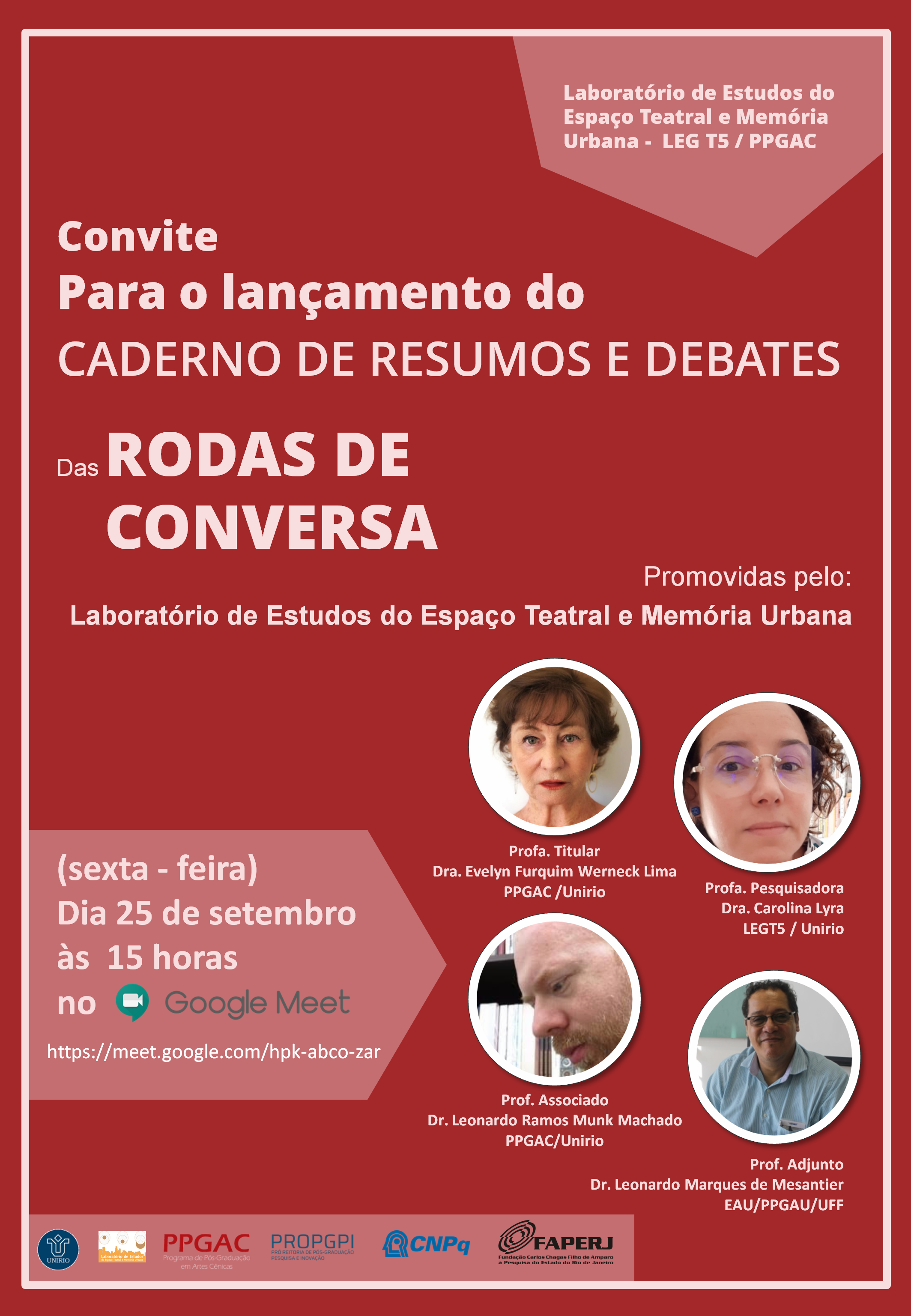 Lançamento - CADERNO DE RESUMOS E DEBATES das Rodas de Conversa - 2020 Aguardamos todas e todos interessados para o lançamento do CADERNO DE RESUMOS E DEBATES, fruto das nossas RODAS DE CONVERSA, que ocorrerá nesta sexta-feira, dia 25 de setembro, às 15h. Vocês poderão acompanhar pelo Google Meet, no link abaixo: Na ocasião, serão discutidos os resultados dos debates, entre as coordenadoras do caderno e os vice-líderes dos projetos "Estudos do Espaço Teatral" e "Espaço, Memória e Projeto Urbano". Esperamos vocês lá! |