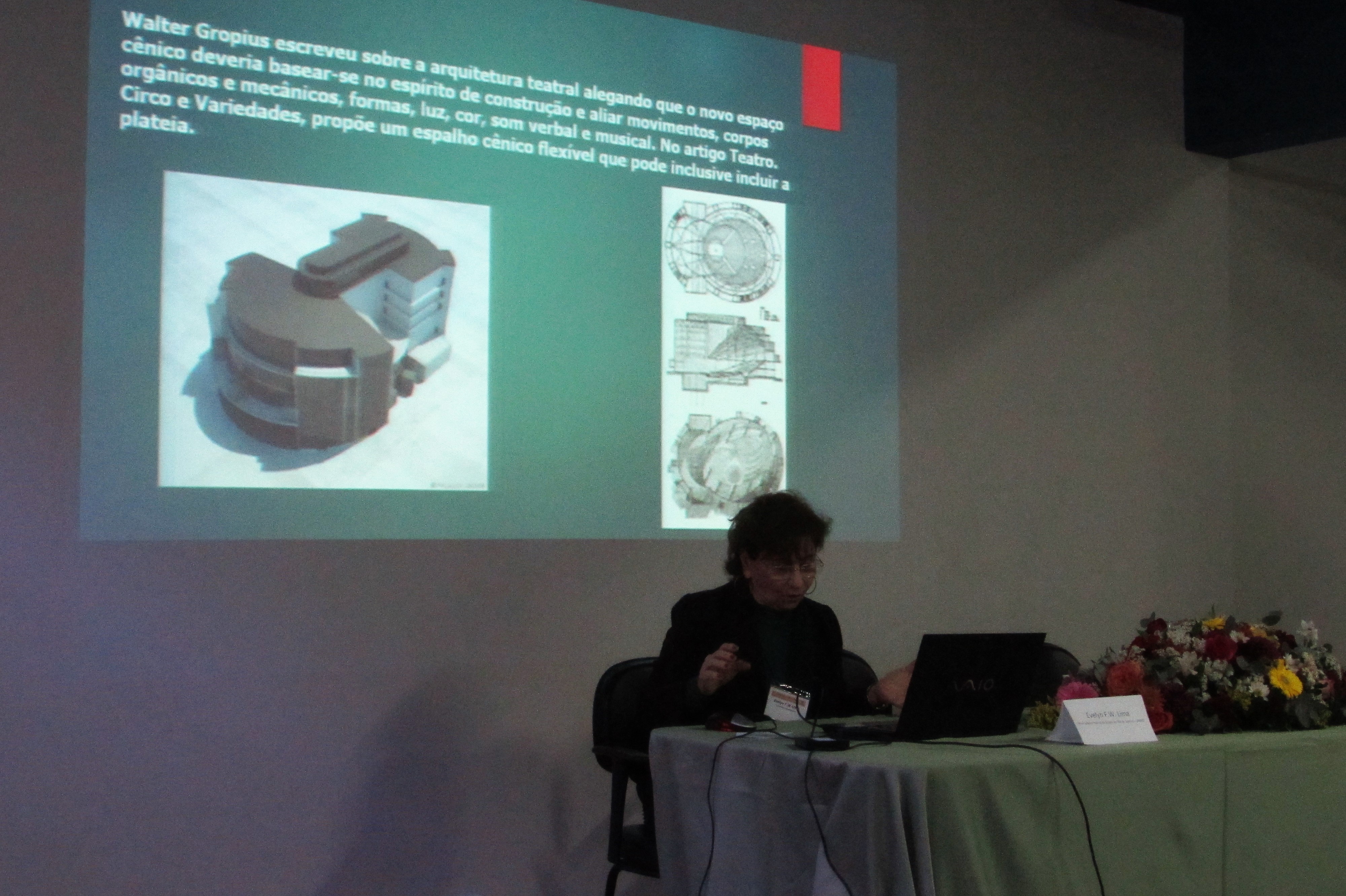 Mesa de Abertura do Third International Conference on Architecture, Theatre and Culture. (©Sara Maranhão) Representando o PPGAC, a Profa. Ana Bulhões, O Vice-Reitor Prof. Ricardo Cardoso (UNIRIO), a Pró-Reitora de Pós Graduação e Pesquisa, Profa. Evelyn Orrico (PROPG) e a Profa. Evelyn Lima (LEG T5). (©Sara Maranhão). Após a cerimônia de abertura, foi exibido o documentário Arquitetura Teatral Contemporânea no Estado do Rio de Janeiro, vencedor do Edital Patrocínio Cultural do Conselho de Arquitetura e Urbanismo CAU /RJ, com direção geral da Profa Evelyn F.W. Lima, versando sobre um dos produtos da pesquisa institucional desenvolvida no Laboratório de Estudos do Espaço Teatral e Memória Urbana-LEG T5. Uma cópia do documentário em DVD foi distribuída entre os conferencista e palestrantes participantes do Third International Conference on Architecture, Theatre and Culture. ©MilenaFernandes Em seguida o convidado internacional Prof Marvin Carlson da City of New York University, um dos maiores estudiosos da arquitetura teatral, proferiu a Conferência Magistral, seguida de debates. Conferência Magistral Prof. Marvin Carlson (©Sara Maranhão) Ainda na noite da abertura do Colóquio, no Espaço Cultural do Centro de Ciências Sociais, foi inaugurada- a Second International Exhibition on Theatre Architecture, exposição bilíngue que atraiu todos os participantes para apreciarem a evolução da arquitetura teatral por meio de maquetes, mapas, plantas e fotografias dispostos no amplo salão. Noite da abertura da Exposição(©Sara Maranhão) Recepção no saguão do Salão da Exposição (©Sara Maranhão)