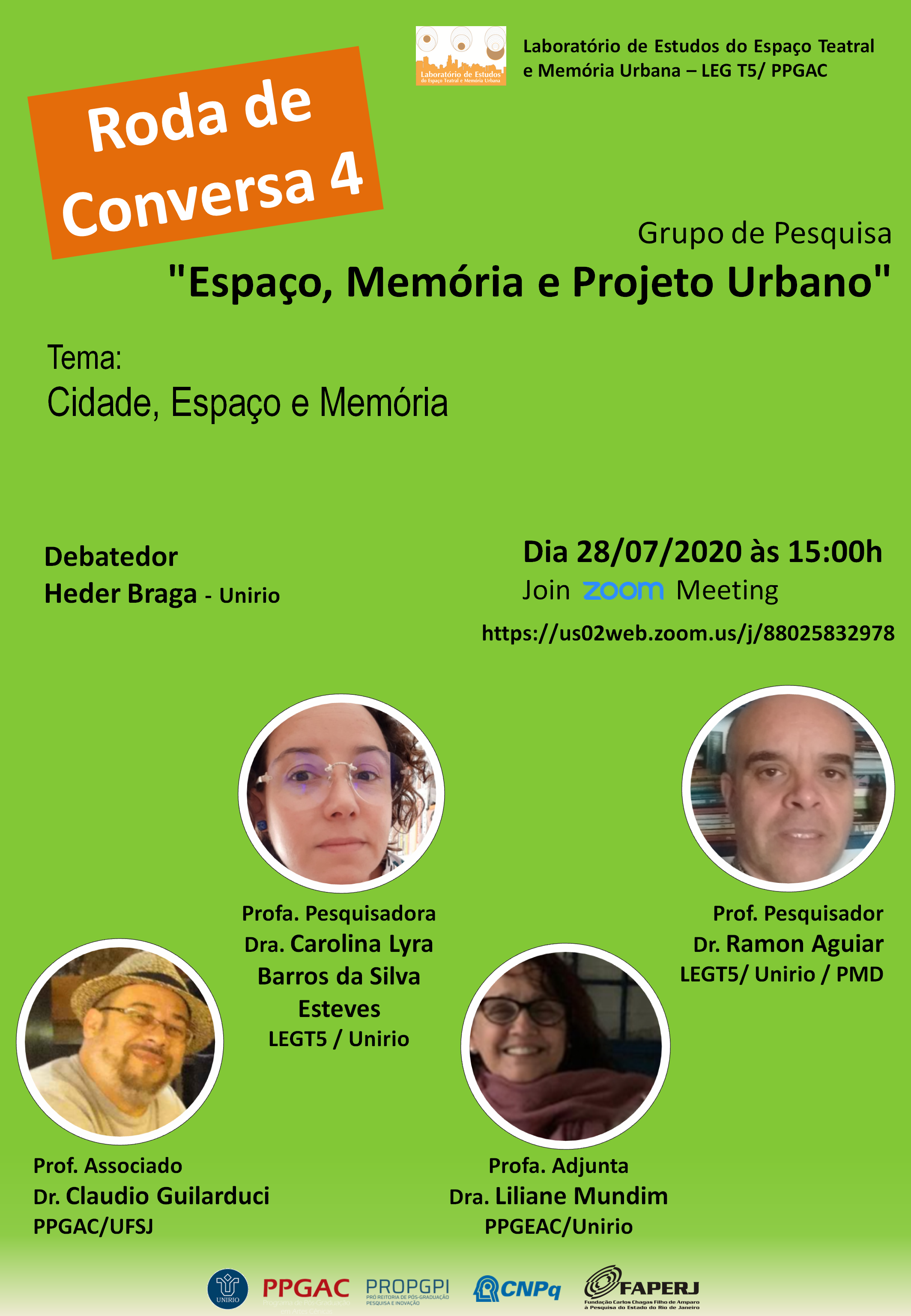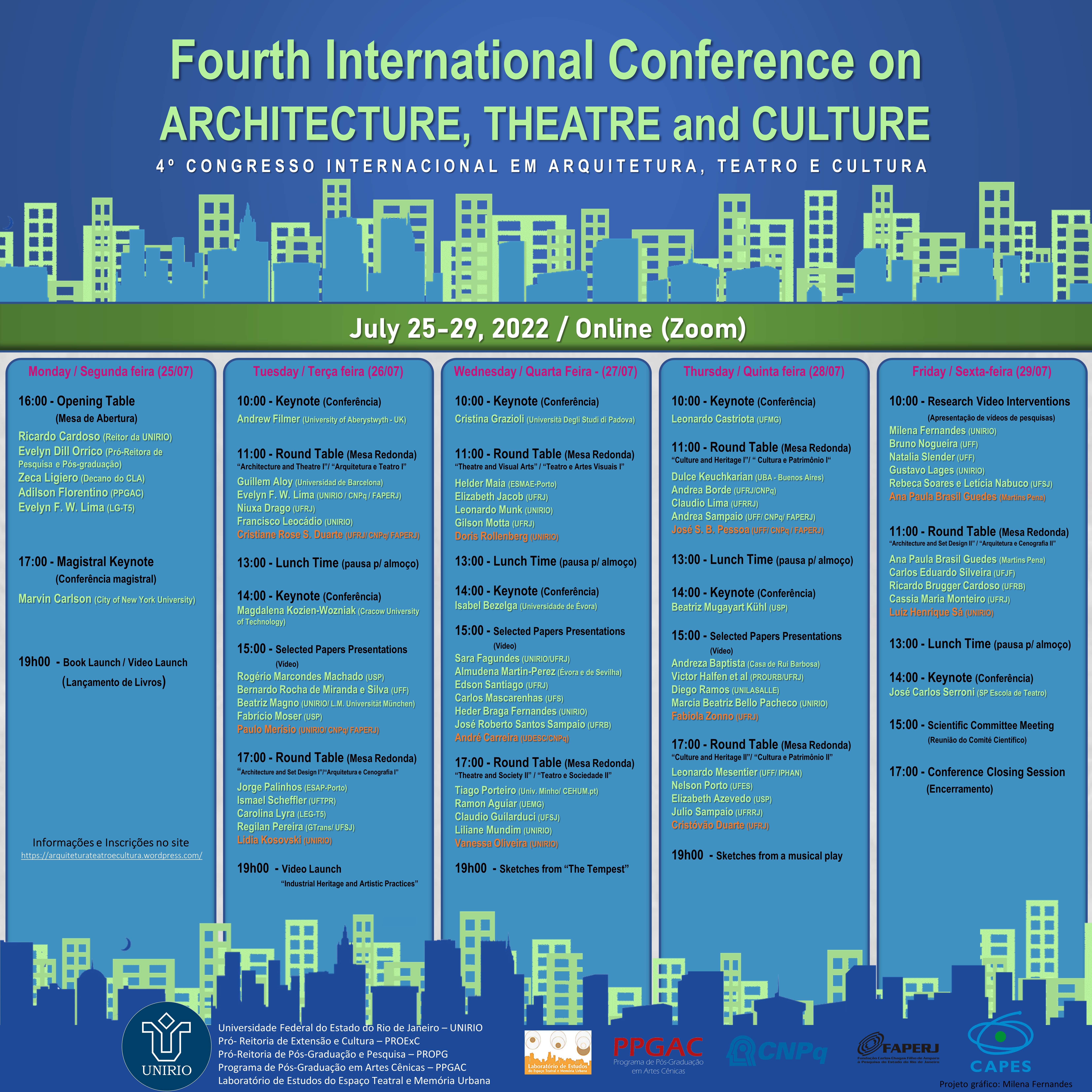 THE FOURTH INTERNATIONAL CONFERENCE ON ARCHITECTURE, THEATRE, AND CULTURE (25-29 JULY) - O evento - 2022 O Laboratório de Estudos do Espaço Teatral e Memória Urbana LEG T5 da Universidade Federal do Estado do Rio de Janeiro - UNIRIO em conjunto com o Programa de Pós-Graduação em Artes Cênicas realizou a IV Conferência Internacional sobre Arquitetura, Teatro e Cultura: Estudos do Espaço Teatral e Memória Urbana – Fourth International Conference on Architecture, Theatre, and Culture nos dias 25, 26, 27, 28 e 29 de julho de 2022, (http://www.arquiteturateatroecultura.com.br), de forma remota. O evento proporcionou aos pesquisadores de diferentes instituições de ensino e pesquisa amplos debates sobre os três eixos disciplinares do Congresso: a Arquitetura Teatral, o Teatro (a cenografia, a cena teatral e as práticas artísticas) e a Cultura (em especial o Patrimônio Cultural e a História Urbana).