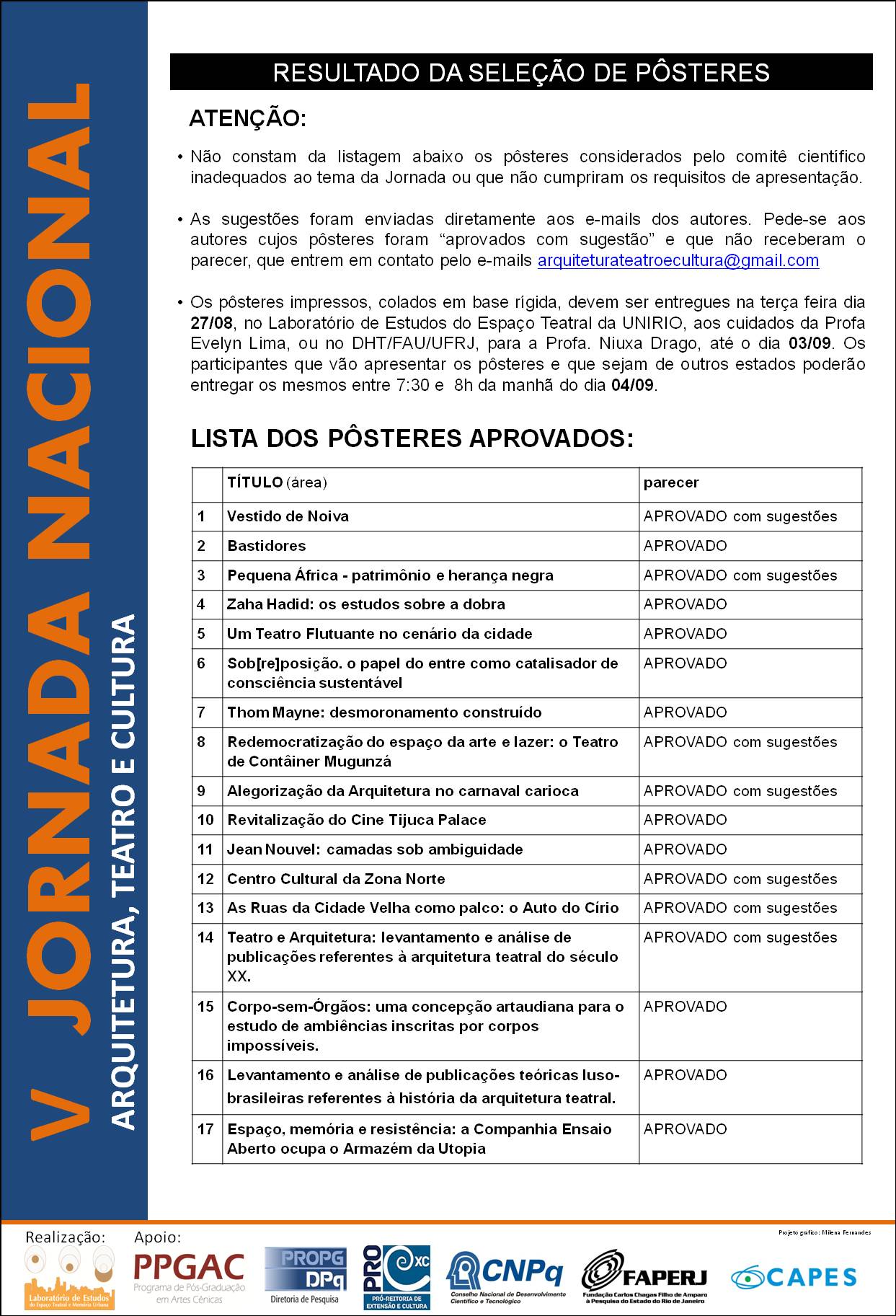 THIRD INTERNATIONAL CONFERENCE ON ARCHITECTURE, THEATRE AND CULTURE (17-21 JULY, 2017) (©Milena Fernandes) O Laboratório de Estudos do Espaço Teatral e Memória Urbana em conjunto com o Programa de Pós Graduação em Artes Cênicas realizou a III Conferência Internacional sobre Arquitetura, Teatro e Cultura: Estudos do Espaço Teatral e Memória Urbana – Third International Conference on Architecture, Theatre and Culture nos dias 17, 18, 19, 20 e 21 de agosto de 2017, na Universidade Federal do Estado do Rio de Janeiro (http://www.arquiteturateatroecultura.wordpress.com). O objetivo do evento foi proporcionar aos pesquisadores de diferentes instituições de ensino e pesquisa amplos debates sobre os três eixos disciplinares com o voltados para as Artes Cênicas: a Arquitetura teatral, o Teatro (a cenografia e a cena teatral) e a Cultura (História Cultural, História da Arquitetura Teatral e História Urbana). O evento constou de 7 conferências, sendo 5 de renomados pesquisadores internacionais, 10 Mesas Redondas, 40 comunicaçõesrais previamente selecionadas pelo Comitê Científico, 21 pôsteres, entre 10:00 e 21:00 longo dos cinco dias, incluindo atividades de extensão como lançamento de livros e a exibição da Second Exhibition on Theatre Architecture - From Renaissance to Contemporaneity. O Congresso foi uma excelente oportunidade para que os alunos e profissionais interagissem com os diversos profissionais do País e do Exterior que atuam nas interseções das área de conhecimento da pesquisa, ampliando a possibilidade de estágios nos Laboratórios de outras universidades no Brasil e no exterior. ©MilenaFernandes O objetivo maior foi incentivar o aprimoramento das atividades de pesquisa, ensino e extensão, entre acadêmicos, professores, pesquisadores, bem como membros da comunidade em geral. No cerne do debate esteve a questão da discussão da arquitetura teatral, das relações entre o teatro e a cidade, do patrimônio cultural bem como as formas de expressão contemporâneas das possíveis adaptações de espaços alternativos para a experiência teatral. No primeiro dia, além da Conferência Magistral, a exibição do documentário e a abertura da exposição sobre arquitetura teatral, ocorreu o lançamento de livros. Houve performances na 5ª feira à noite e visitação de alunos de escolas próximas com explicações sobre o que é um edifício teatral, com monitoria de bolsistas I/C, em várias tardes. No último dia do Congresso, dia 21 de julho, realizou-se a reunião do Comitê Científico para avaliar as inovações e contribuições introduzidas pelos pesquisadores nacionais e internacionais que investigam os três temas da Conferência, sendo produzida uma Ata com uma análise circunstanciada do estado da arte nos três campos de pesquisa. Considerando que o enfoque da Third International Conference on Architecture, Theatre and Culture foi primordialmente discutir a arquitetura teatral e os espaços teatrais modernos e contemporâneos, foram convidados para discutir as relações entre a arquitetura, a cenografia, a dramaturgia e a história cultural dos séculos XX e XXI, professores de reconhecido mérito internacional de grandes instituições estrangeiras. Um dos keynote speakers foi Professor PhD Marvin Carlson da City University of New York, com livros também traduzidos em várias línguas, pesquisador incansável das relações entre a cidade e o teatro, publicado no Brasil pela UFMG. Consideramos uma grande honra o Professor Carlson ter aceito o convite para fazer a conferência magistral do Congresso Internacional, partilhar com a audiência suas pesquisas e conhecimento e participar do Comitê Científico, opinando sobre os papers submetidos. Outra conferencista eminente foi a renomada estudiosa da arquitetura teatral Professora PhD Juliet Rufford, da Universidade de Exeter, autora, entre outros, do livro Theatre and Architecture e coordenadora do Theatre Architecture Working Group do Internacional Federation of Theatre Reseach. A Dra Rufford discutiu em sua conferência as experiências de vários países para criar espaços teatrais criativos que incluam as comunidades em suas performances. Participou também como Keynote Speaker a Professora PhD Dorita Hannah, da University of Tasmania, também autora de inúmeras obras de arquitetura teatral e desenho da cena e uma das mais conhecidas estudiosas da arquitetura dedicada às artes performáticas, que proferiu interessante conferência sobre a arquitetura teatral que teria decorrido das indagações de Nietzsche sobre o tema. Para melhor compreender as relações entre os edifícios teatrais do início do século XX e as questões da iluminação cênica, convidamos a Professora Doutora Cristina Grazioli, da Università Degli Studi di Padova, com a qual temos um Acordo de Cooperação Internacional, que proferiu uma conferência com uma recente descoberta sobre a modernização da arquitetura teatral nas primeiras décadas do século XX. Ainda sobre as relações entre o espaço e teatro, o Professor Doutor Helder Maia da ESMAE do Porto dissertou sobre recentes experiências performáticas sob a ótica da geografia e da antropologia cultural. Em síntese, os cinco pesquisadores estrangeiros, tendo dois integrado a Comissão Científica, garantiram o nível de excelência desta terceira edição do Congresso. Cabe ressaltar que a conferência do arquiteto e Professor João Calafate sobre cinco teatros readaptados no Rio de Janeiro e a conferência do cenógrafo e Professor Helio Eichbauer contaram também com o auditório repleto e contribuíram para a discussão de inúmeros questionamentos teóricos e práticos que entusiasmaram a plateia. Para documentar o evento, foram publicados em versão impressa o Book of Abstracts / Caderno de Resumos Expandidos do Terceiro Colóquio Internacional Arquitetura, Teatro e Cultura (ISSN 2178-2539) e o Book of the Exhibition em versão bilíngue Portu
