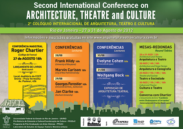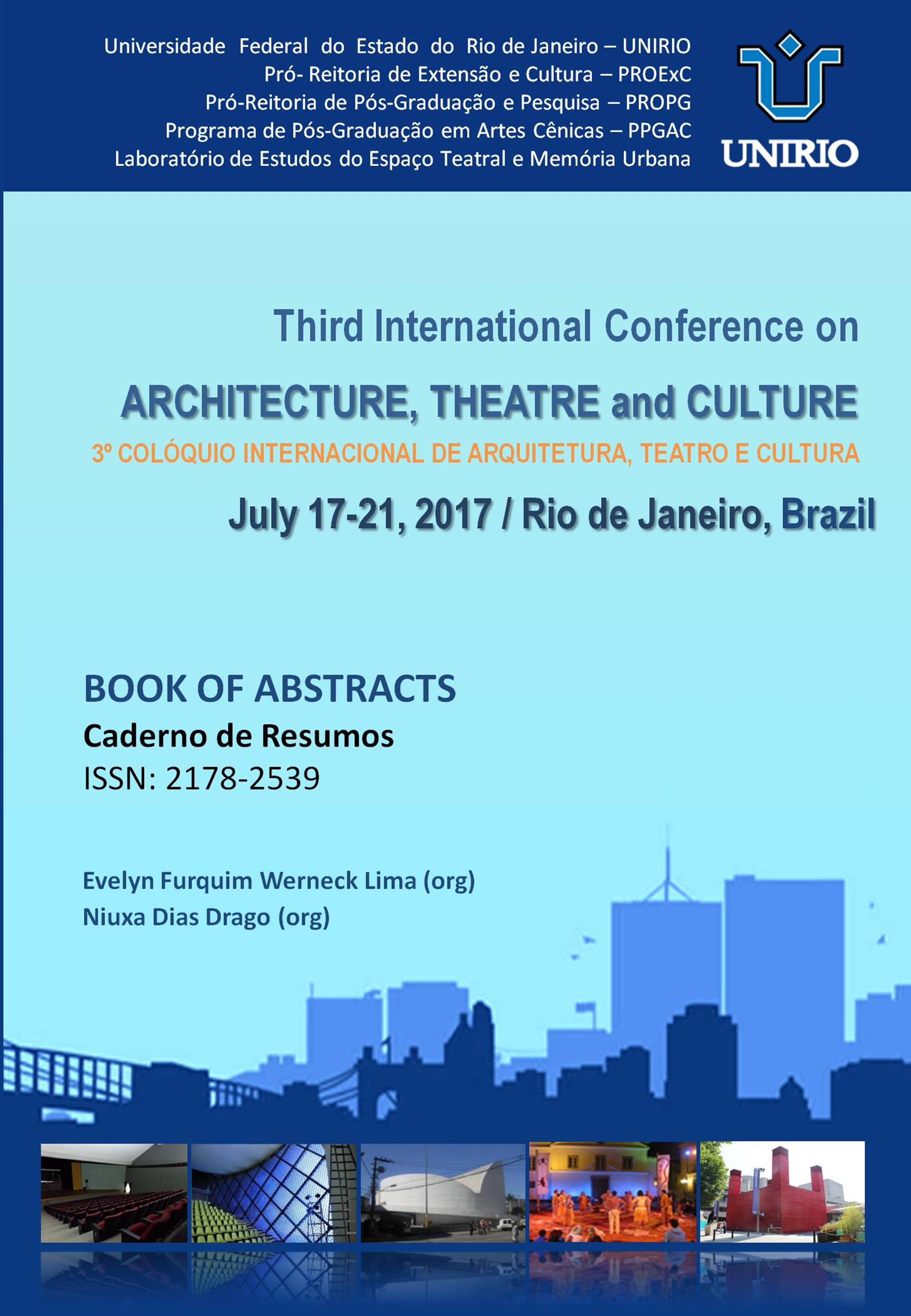 Ver - CONFERÊNCIAS E PALESTRAS O Laboratório de Estudos do Espaço Teatral e Memória Urbana em conjunto com o Programa de Pós Graduação em Artes Cênicas realizou a II Conferência Internacional sobre Arquitetura, Teatro e Cultura: Estudos do Espaço Teatral e Memória Urbana – Second International Conference on Architecture, Theatre and Culture foi realizada nos dias 27, 28, 29, 30 e 31 de agosto de 2011, na Universidade Federal do Estado do Rio de Janeiro (http://www.arquiteturateatroecultura.wordpress.com). O evento constou de conferências, mesas redondas e comunicações ao longo dos dias e atividades de extensão como lançamento de livros e exposição sobre arquitetura teatral. No dia 31 de agosto realizou-se a reunião do Comitê Científico para avaliar as inovações e contribuições introduzidas pelos pesquisadores nacionais e internacionais que investigam os três temas da Conferência. Para documentar o evento, foi publicado o Book of Abstracts / Caderno de Resumos Expandidos do Segundo Colóquio Internacional Arquitetura, Teatro e Cultura (ISSN 2178-2539) em versão bilíngue Português-Inglês.