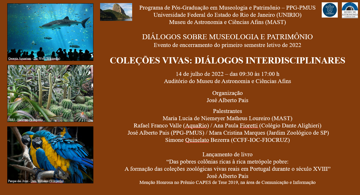 No dia 1º de Agosto, no Museu do Amanhã, foram realizadas Conferências Magistrais da Profa. Dra. Maria Isabel Roque (Universidade Católica, Lisboa, Portugal), do Prof. Dr. Eduardo Pires de Oliveira – IHA/FL (Universidade de Lisboa, Portugal), da Profa. Dra. Myriam Andrade Ribeiro de Oliveira (Profa. Visitante, PPG-PMUS), do MsC. Julio Cézar Neto Dantas, Diretor, Museu de Arte Sacra de Paraty (Doutorando em Museologia e Patrimônio, PPG-PMUS) e do Prof. Dr. José Ligiero (PPGA / CLA).
