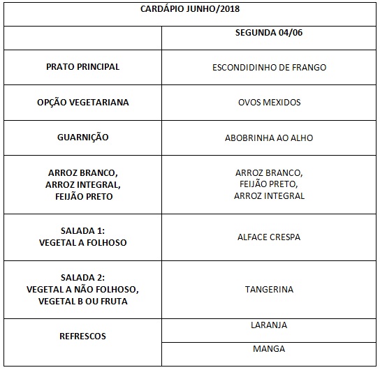 Você está aqui: Página Inicial / Nutrição PRAE(erro) / Cardápios RE PUPO / 04-06-18