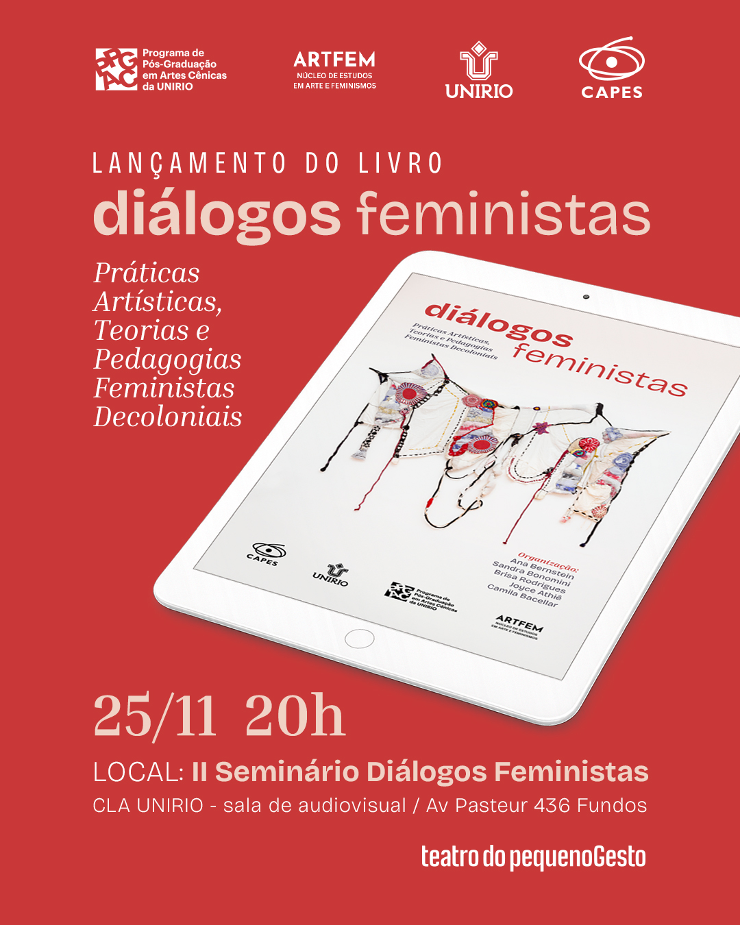 A abertura do II Seminário Diálogos Feministas contará com o lançamento do ebook Diálogos Feministas - Práticas Artísticas, Teorias e Pedagogias Feministas Decoloniais. A publicação reúne ensaios, palestras e intervenções artísticas do I Seminário, realizado em 2024 pelo Programa de Pós-Graduação em Artes Cênicas da UNIRIO.