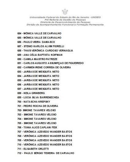 Mais informações podem ser obtidas no Setor de Acompanhamento e Análise do Processo de Trabalho (SAAPT) no telefone: (21) 2542-5523 ou através do e-mail progepe.saapt@unirio.br.