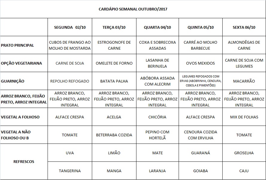 Você está aqui: Página Inicial / Nutricao-prae-corrigido / Cardápios RE / 02-10 a 06-10-17