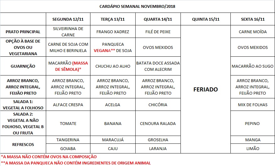 Você está aqui: Página Inicial / Nutrição PRAE(erro) / Cardápios RE PUPO / 12 A 16-11-18