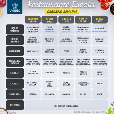 Cardápio do Restaurante Escola de 16 a 20/03/26 16/03/2026