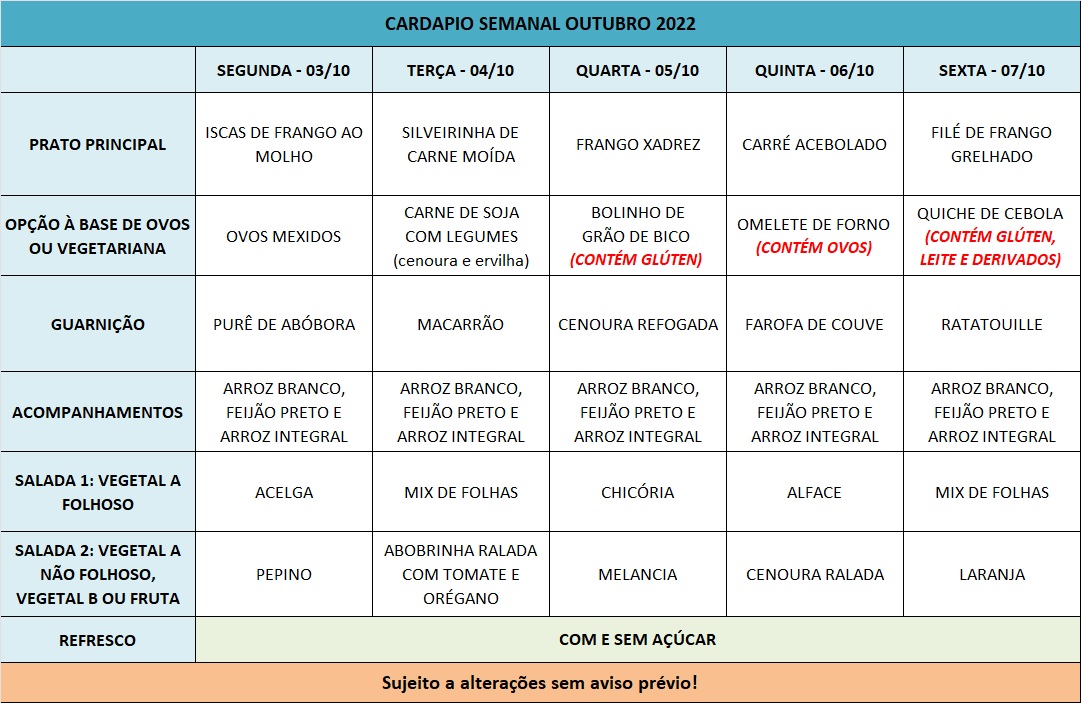 Você está aqui: Página Inicial / Nutrição PRAE(erro) / Cardápios PUPO 2022 / 03 a 07/10/22