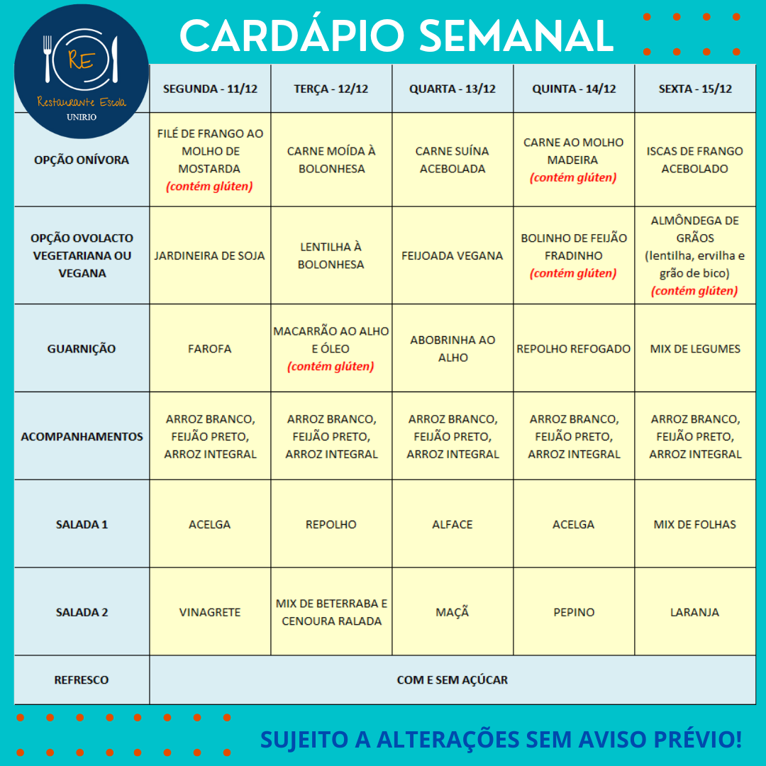 Cardápio do Restaurante Escola de 15 a 19/12/25 30/11/2025