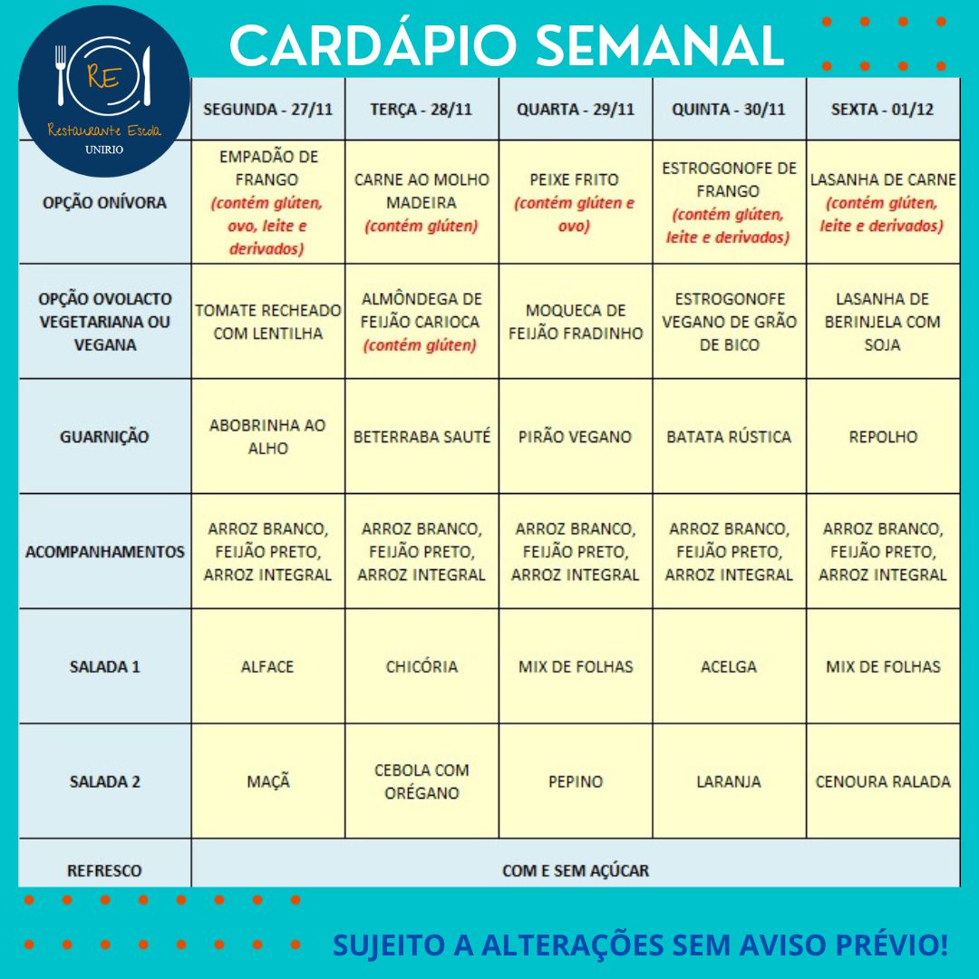 Cardápio do Restaurante Escola de 15 a 19/12/25 30/11/2025