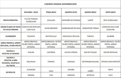 Você está aqui: Página Inicial / Nutrição PRAE(erro) / Cardápios RE PUPO / 05-11 A 09-11-18