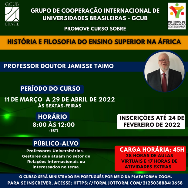 A data limite para as inscrições do Curso História e Filosofia do Ensino Superior na África, a ser ministrado pelo Professor Doutor Jamisse Taimo, se encerram em 24 de fevereiro de 2022. O curso tem como objetivo, situar a África no debate sobre a Educação Superior. Especificamente o curso pretende aprofundar questões sobre quatro grandes temas: i) a gênese da universidade na África, ii) Pesquisa e Ensino Superior no continente, iii) Governança, Políticas e Gestão das universidades, e iv) Educação Superior, Internacionalização e Globalização.