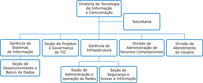 Organograma DTIC; primeiro nível: Diretoria de Tecnologia da Informação e Comunicação; Segundo nível: Secretaria; Segundo nível: Gerência de Sistemas de Informação com subnível Seção de Desenvolvimento e Banco de Dados; Segundo nível: Seção de Projetos e Governança de TIC; Segundo nível: Gerência de Infraestrutura com subnível Seção de Administração e operação de Redes e subnível Seção de Segurança e Acesso à informação; Segundo nível: Divisão de Administração de Recursos Computacionais; Segundo nível: Divisão de Atendimento ao Usuário.