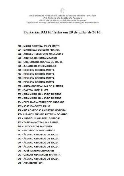 Mais informações podem ser obtidas na Divisão de Acompanhamento Funcional e Formação Permanente (DAFFP) no telefone (21) 2542-5516 ou através do e-mail progepe.daffp@unirio.br.