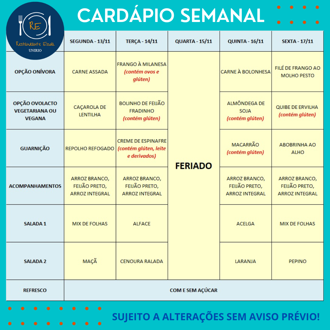 Cardápio do Restaurante Escola de 15 a 19/12/25 30/11/2025