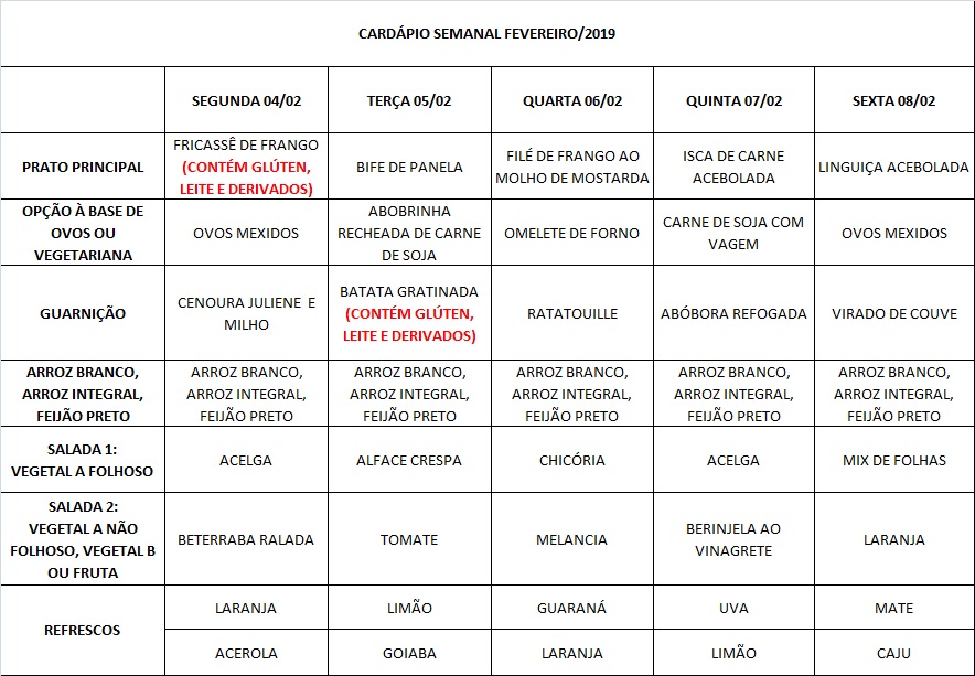 Você está aqui: Página Inicial / Nutrição PRAE(erro) / Cardápios RE PUPO / 04-02 a 08-02-19