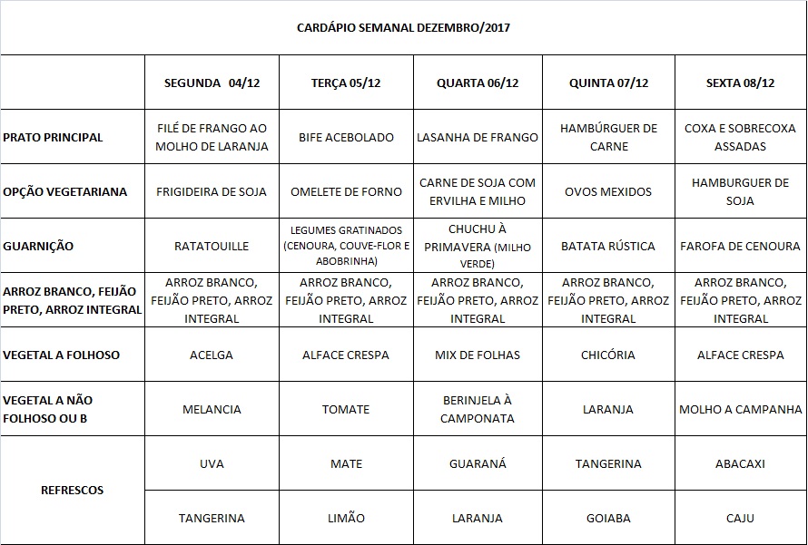 Você está aqui: Página Inicial / Nutrição PRAE(erro) / Cardápios RE PUPO / 04-12 a 08-12-17