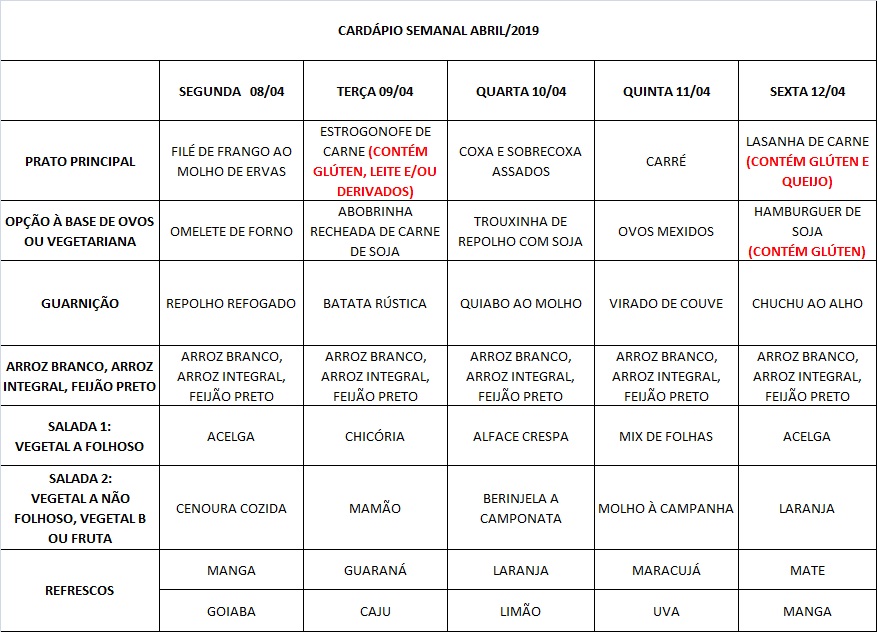 Você está aqui: Página Inicial / Nutrição PRAE(erro) / Cardápios RE PUPO / 08-04 a 12-04-19