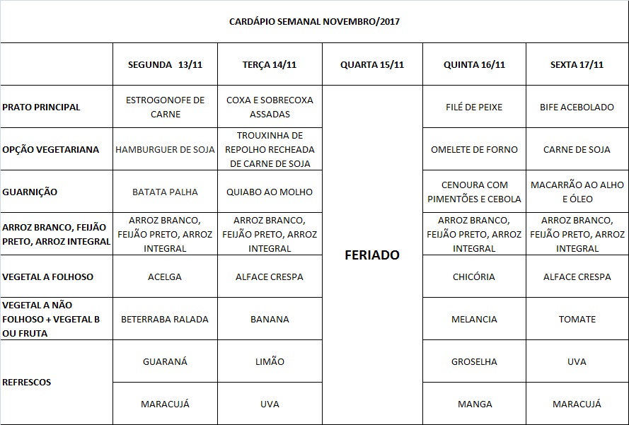 Você está aqui: Página Inicial / Nutrição PRAE(erro) / Cardápios RE PUPO / 13 a 17/11/17