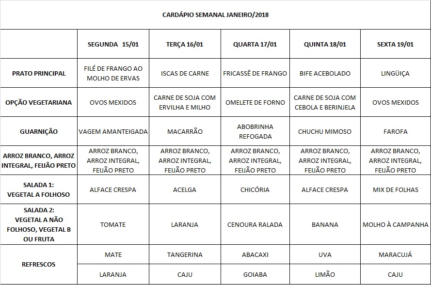 Você está aqui: Página Inicial / Nutrição PRAE(erro) / Cardápios RE PUPO / 15/01 a 19/01/18