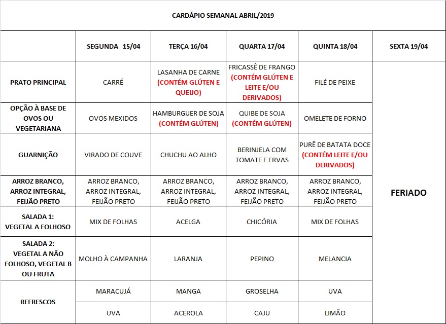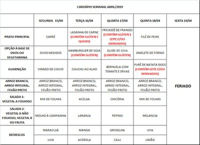 Você está aqui: Página Inicial / Nutrição PRAE(erro) / Cardápios RE PUPO / 15-04 a-19-04-19