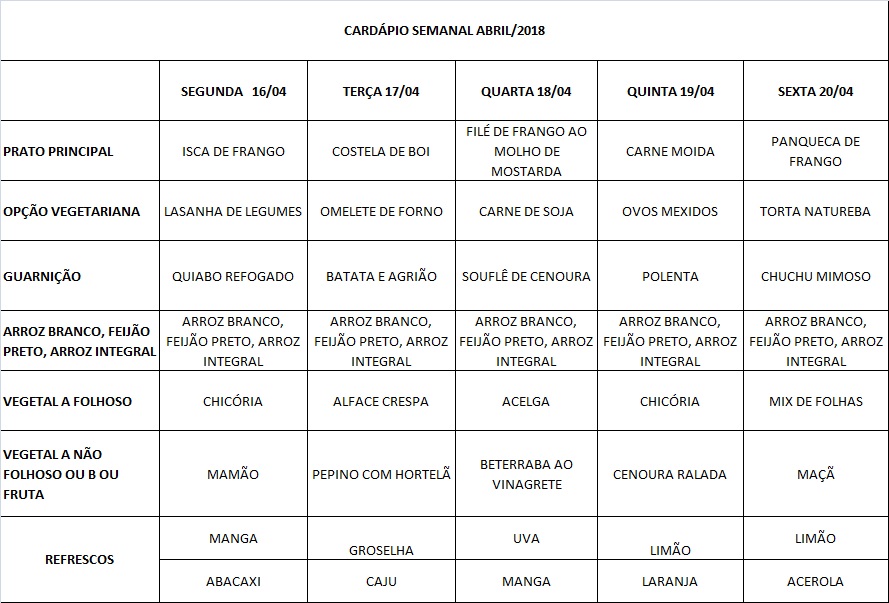 Você está aqui: Página Inicial / Nutrição PRAE(erro) / Cardápios RE PUPO / 16-04 a 20-04-18