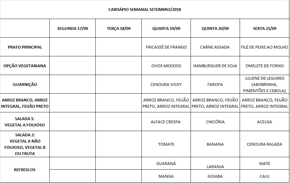 Você está aqui: Página Inicial / Nutrição PRAE(erro) / Cardápios RE PUPO / 17-09 a 21-09-18