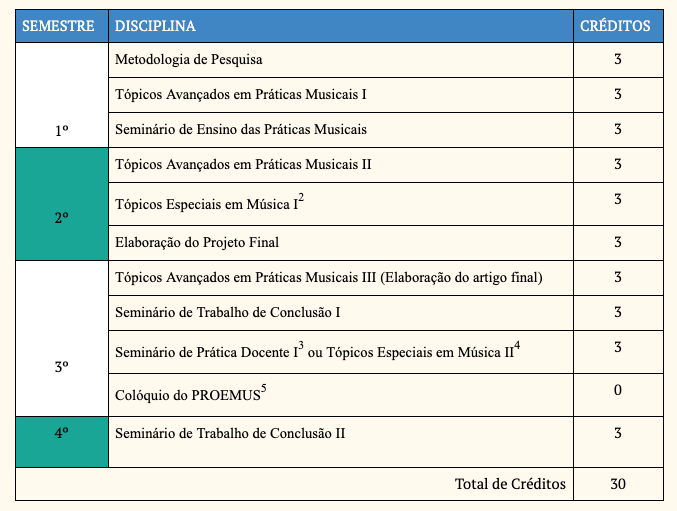 O aluno deverá cursar uma disciplina de um programa acadêmico de pós-graduação em música strictu sensu, escolhida de acordo com sugestão do orientador.