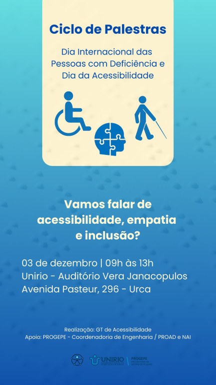 Com o objetivo de chamar a atenção da comunidade acadêmica para as questões de Acessibilidade e Inclusão na UNIRIO, servidores com deficiência se unem com apoio do Setor de Atenção à Saúde do Trabalhador - SAST, da Pró-Reitoria de Gestão de Pessoas - PROGEPE; do Núcleo de Acessibilidade e Inclusão - NAI e da Coordenadoria de Engenharia, da Pró-Reitoria de Administração - PROAD para discutir sobre Acessibilidade e Inclusão no Dia Internacional das Pessoas com Deficiência, 3 de dezembro, das 9h às 13h, no Auditório Vera Janacopulos, localizado no Prédio da Nutrição, no Campus da Reitoria, na Avenida Pasteur, 296, na Urca.