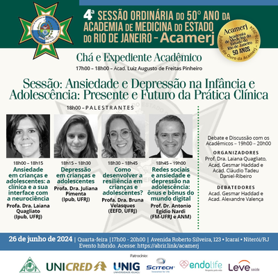 A Academia de Medicina do Estado do Rio de Janeiro - Acamerj, tem o prazer de convidar os Confrades e Confreiras, a comunidade médica e o público interessado para a Sessão "Ansiedade e Depressão na infância e Adolescência: Presente e Futuro da Prática Clínica", a realizar-se em 26 de junho a partir das 18:00h, com Chá Acadêmico às 17:00h.