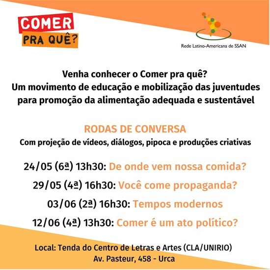 Com o tema "Você come propaganda?", será realizada nesta quarta-feira, 29 de maio, a  segunda roda de conversa promovida pelo movimento Comer pra quê?, no âmbito do projeto da RedeSSAN-UNIRIO (Rede Latinoamericana de Soberania e Segurança Alimentar e Nutricional).