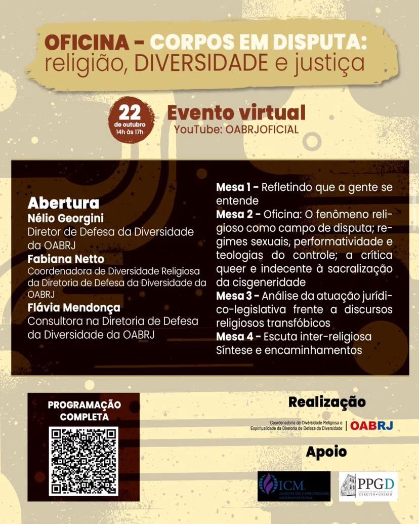 Na próxima quarta-feira, dia 22 de outubro, vamos a Oficina "Corpos em Disputa: religião, DIVERSIDADE e justiça", um evento online com transmissão no YouTube em parceria com a Comissão de Diversidade Religiosa e Espiritualidade da Diretoria de Defesa da Diversidade, com apoio do PPGD/UNIRIO e o ICM.