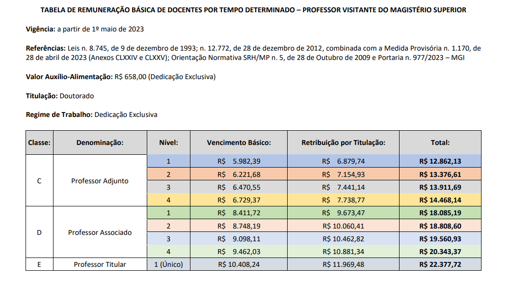Tabela de Retribuição por Titulação - RT para o Regime de Dedicação Exclusiva