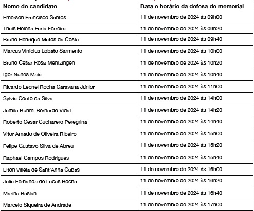 - Cada candidato terá 10 minutos para apresentar seu memorial.