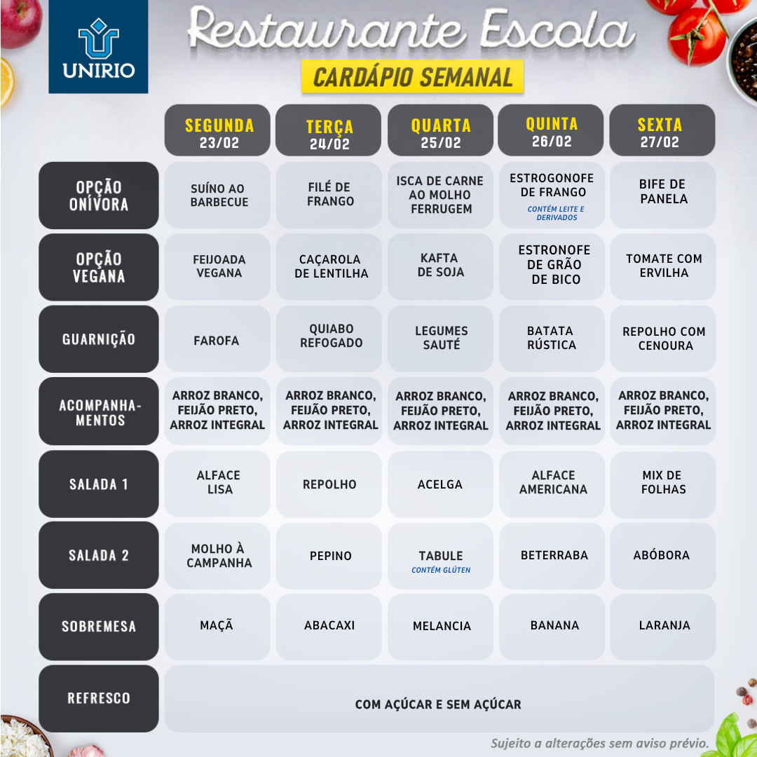 Cardápio do Restaurante Escola de 23 a 27/02/26 23/02/2026