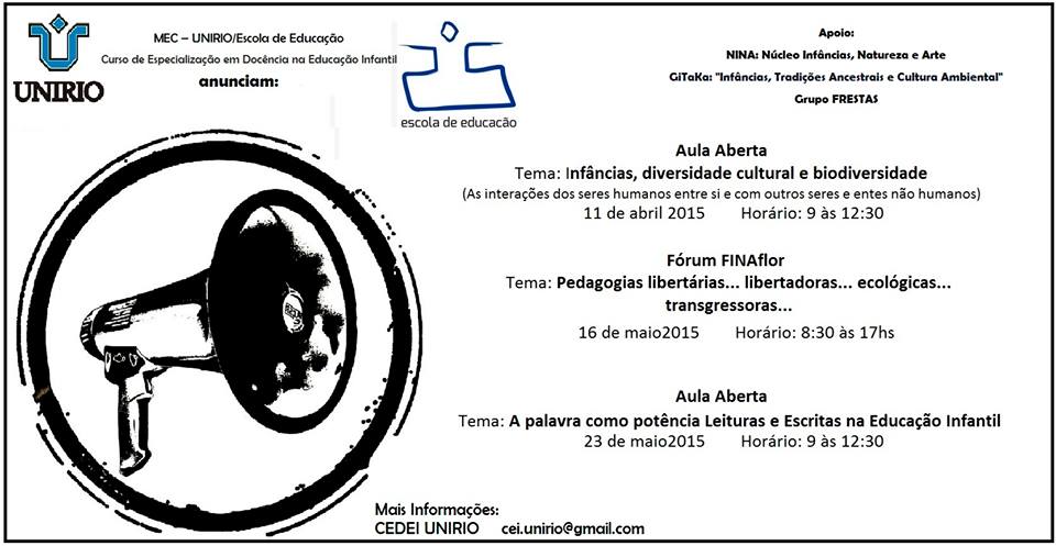 Ainda neste semestre, o Cedei promoverá o Fórum FINAFlor, com o tema Pedagogias libertárias... Libertadoras... Ecológicas... Transgressoras, e uma segunda aula aberta, que discutirá A palavra como potência: leituras e escritas na educação infantil. Confira a programação.
