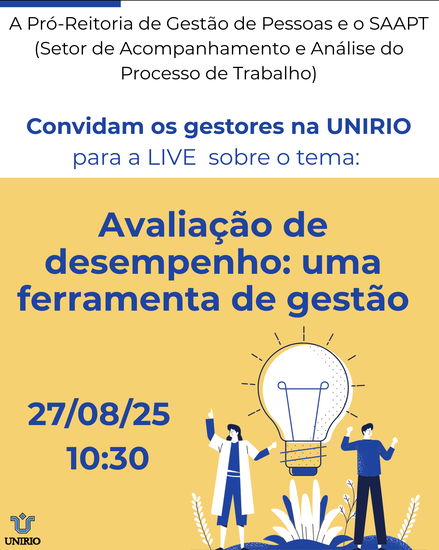 Avaliação de desempenho: uma ferramenta de gestão. Esse é o tema da live que a Pró-Reitoria de Gestão de Pessoas (Progepe) irá realizar no dia 27 de agosto, às 10h30. O público-alvo são pessoas que exercem cargos de gestão na UNIRIO.