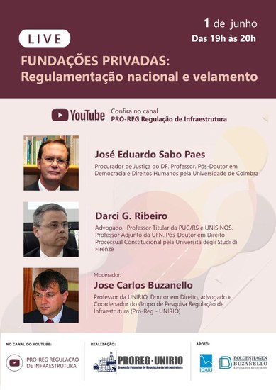 Fundações privadas: regulamentação nacional e velamento. Esse é o tema da live que o Grupo de Pesquisa de Regulação da Infraestrutura (Pro-Reg) promove nesta quarta-feira, dia 1º, das 19h às 19h50.