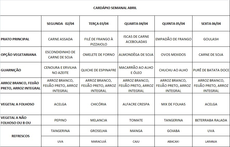 Você está aqui: Página Inicial / Nutricao-prae-corrigido / Cardápios RE / Cardápios RE PUPO / 02-04 a 06-04-18