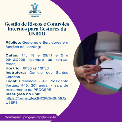 A Pró-Reitoria de Gestão de Pessoas (PROGEPE), por meio do Setor de Formação Permanente - SFP, informa a abertura das inscrições para o curso “Gestão de Riscos e Controles Internos para Gestores da UNIRIO”.