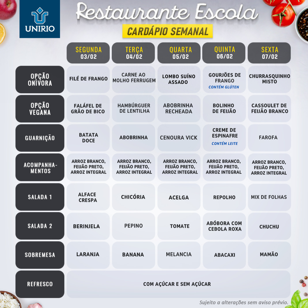 | 26/12/2025 | Cardápio do Restaurante Escola de 01 a 05/12/25 |