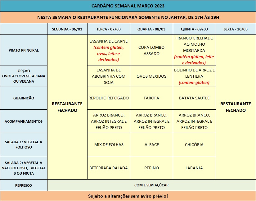 Você está aqui: Página Inicial / Nutrição PRAE(erro) / Cardápios PUPO 2023 / 06/03 a 10/03/2023