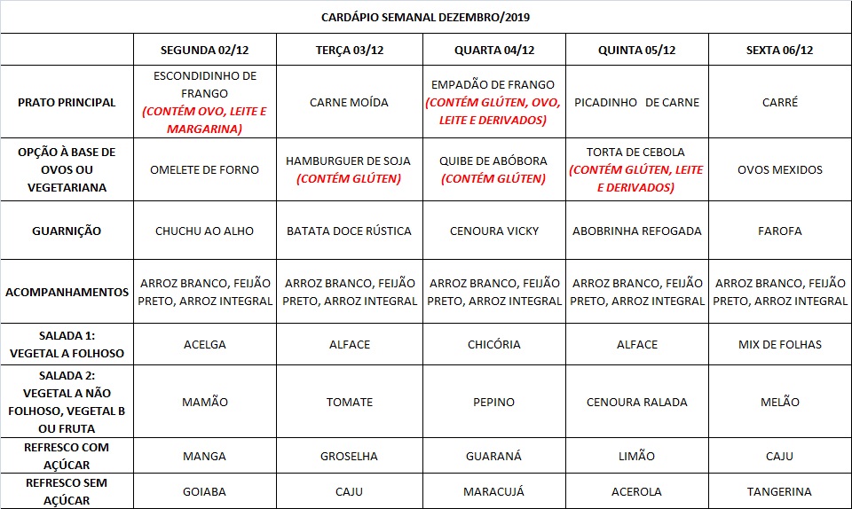 Você está aqui: Página Inicial / Nutrição PRAE(erro) / Cardápios RE PUPO / 02/12 A 06/12/19