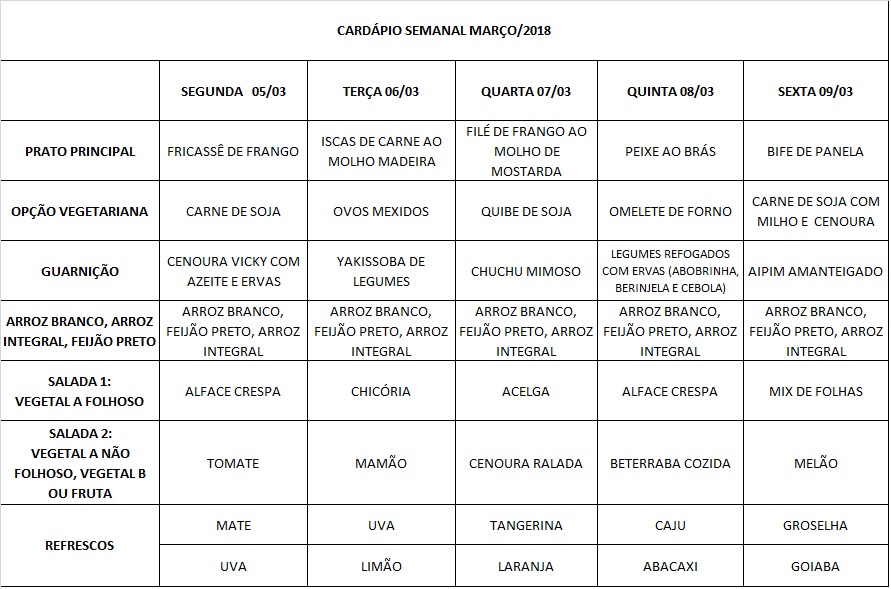 Você está aqui: Página Inicial / Nutrição PRAE(erro) / Cardápios RE PUPO / 05-03 a 09-03-18