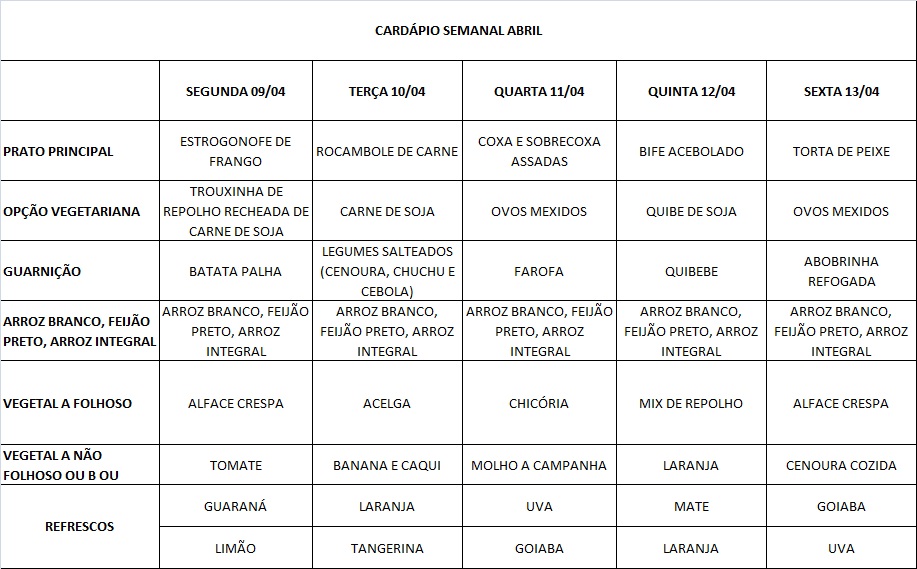 Você está aqui: Página Inicial / Nutrição PRAE(erro) / Cardápios RE PUPO / 09-04 a 13-04-18
