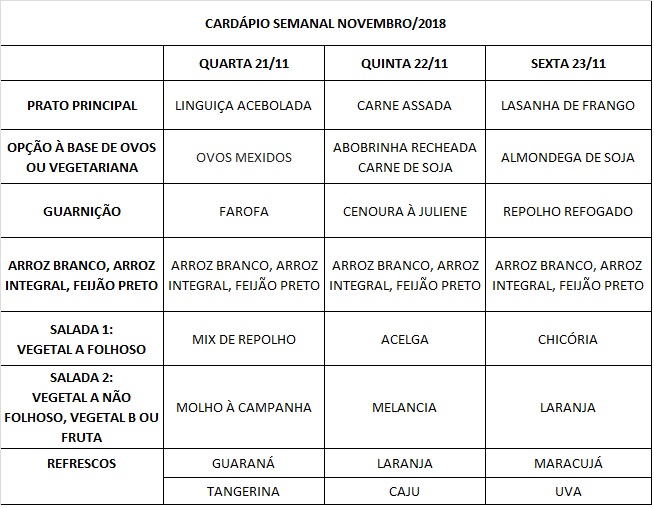 Você está aqui: Página Inicial / Nutrição PRAE(erro) / Cardápios RE PUPO / 21-11 A 23-11-18