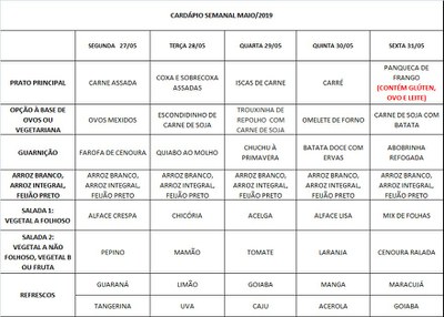 Você está aqui: Página Inicial / Nutrição PRAE(erro) / Cardápios RE PUPO / 27-05 a 31-05-19